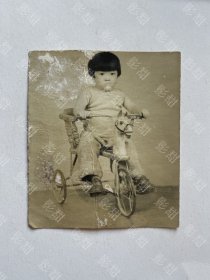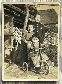 民国时期三名儿童骑儿童三轮车留影银盐老照片