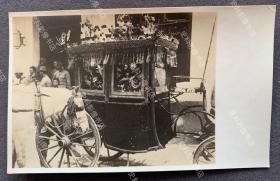 【望江旧影】抗战时期 安徽省望江县(今属安庆)上流家庭结婚时使用的豪华三轮花轿车 原版老照片一枚(照片曾刊登于出版物《岚六二一三部队写真集》的第70页。花轿下部装有三个大轱轮,上部绣有各式吉祥图案和立体塑像,车头可坐人,造型像工业革命早期蒸汽三轮车,其中有几名侵华日军第116师团步兵第109联队士兵夹杂在围观百姓人群中。)