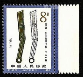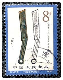 袁袁收藏 中国邮票 t71 1981年 发行量258万 古代钱币2组 明刀 8-6 信销 东周时代,质地为铜。上有“齐法化”三字,战国时燕国的主要铸币。它铸行时间长、流通广,数量多。
