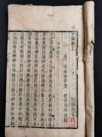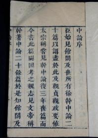 《中论》卷上、下。,东汉“建安七子”之一的徐干所著。分:治学、修本、智行、爵禄、亡国、赏罚等二十篇。徐干是山东潍坊人,在曹操、曹丕两父子手下均受重用。此为清光绪刻本。