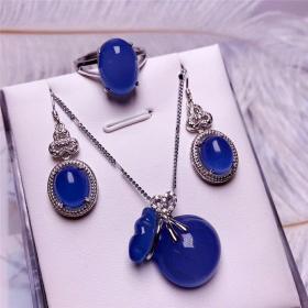 S925纯银镶嵌红蓝绿白玛瑙玉髓银吊坠戒指耳环三件套首饰套装礼品 多款颜色
