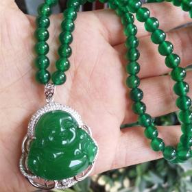 天然玛瑙冰彩绿玉髓笑佛镶嵌925银项链吊坠挂件男女款