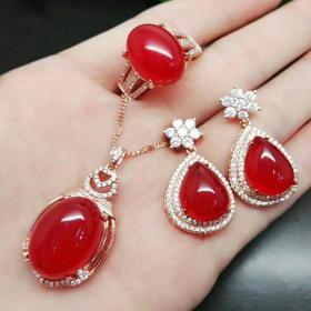 纯天然玉髓冰种吊坠玛瑙耳钉戒指三件套镶银
