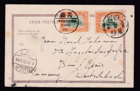 (9136)清上海照相版明信片(有上海乡下)照片中有新大昌洋行广告贴宣统万寿2分2枚(可能后贴销四川万县已西九月廿四及当天万县09.NON.6汉英单线戳寄德国泼恩)