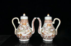 元代枢府沥粉描金龙纹瓜棱壶一对