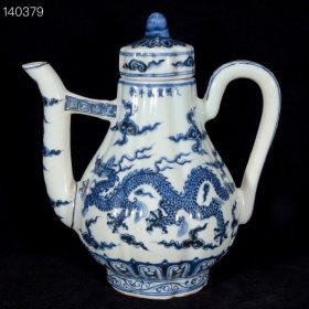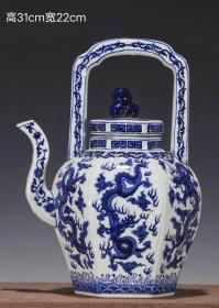 16_美品·款识“大明宣德年制”精工细作满工青花龙纹瓜棱提梁壶。