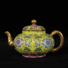 清雍正黄地珐琅彩缠枝西番莲花卉纹瓜棱南瓜壶 高9.5厘米 直径15厘米