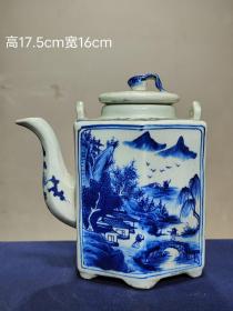 “大清康熙年制”精工细作满工青花通景山水纹瓜棱提梁壶。
