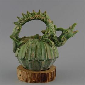★秒杀价1160元★精品古瓷■【★★唐代翡翠绿釉龙柄瓜棱纹提梁倒流壶