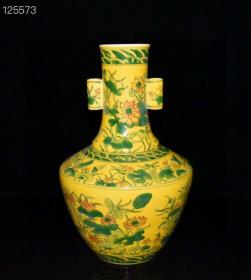 清代乾隆黄釉斗彩荷花纹贯耳瓶