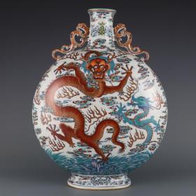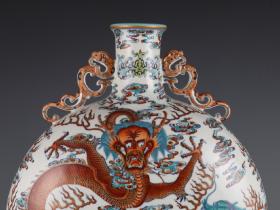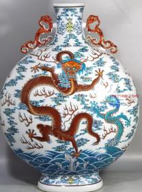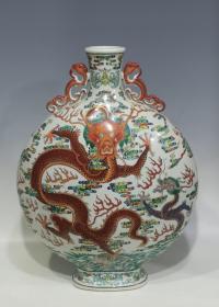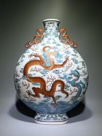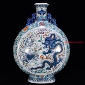 清乾隆款 青花斗彩苍龙教子双耳抱月扁瓶 高50,肚直径37.5,宽19,(拍卖同款)现货