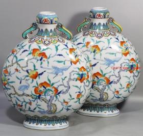 大清乾隆年制青花斗彩福寿图双耳扁瓶1对