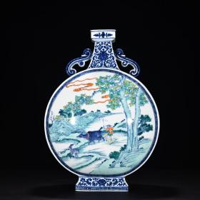 清乾隆青花开窗斗彩耕牧抱月扁瓶