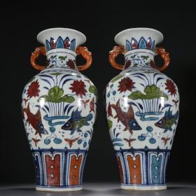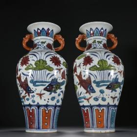 明代 五彩连年有余双兽耳瓶一对
