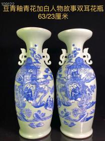 清晚期豆青釉青花加白人物故事纹双兽耳花瓶 !