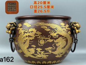 乡下收旧藏——大明宣德五年监督工部官臣吴邦佐造、老紫铜鎏真金龙凤戏珠双兽耳大缸,高20厘米、口径25.5厘米、重26.5斤,器型规整,品相端正,雕刻精美、工艺精湛、纯手工打造,包浆浑厚自然,保存完好,喜欢的朋友联系a162