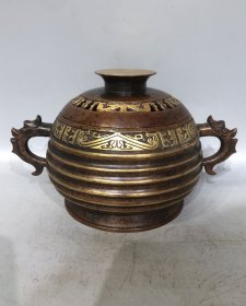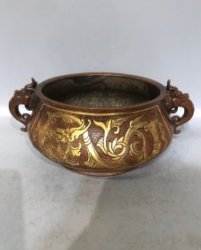 紫铜高浮雕鎏真金双兽耳鎏金炉长25.5厘米高10.5厘米香炉重3222克