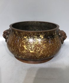 紫铜洒金双兽鎏金香炉香炉长27厘米高12.5厘米重10.7斤
