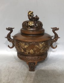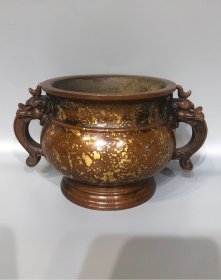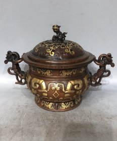 紫铜高浮雕鎏真金双兽耳鎏金炉长23厘米高13.5厘米香炉重3191克