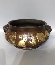 紫铜高浮雕鎏真金双兽耳十二生肖鎏金炉长21.5厘米高9厘米香炉重3101克