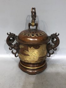 紫铜高浮雕鎏真金双兽耳鸳鸯戏水鎏金炉长18厘米高21厘米香炉重2583克