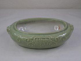 80年代石湾窑豆青釉双兽耳椭圆水仙盆