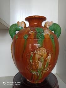 双兽耳绶带图纹三彩罐