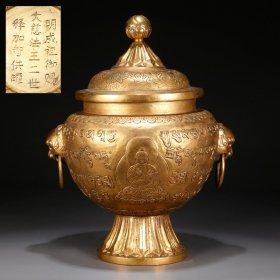 铜鎏金刻佛像双兽耳盖罐