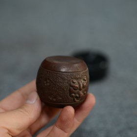 旧藏宜兴老紫砂朱泥手工雕刻双兽耳鼓形摆件