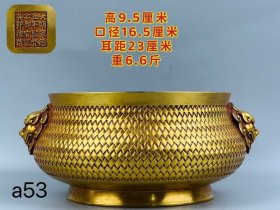 59_旧藏——大明宣德款,紫铜鎏金双兽耳香炉,高9.5厘米、口经16.5厘米、耳距23厘米、重6.6斤!器型规整,品相端正,雕刻精美、工艺精湛、纯手工打造,包浆浑厚自然,保存完好,喜欢的朋友联系a53
