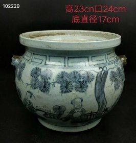 81_清代 青花人物 双兽香炉摆件