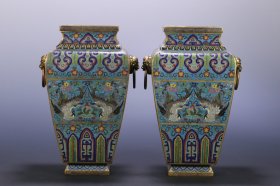 清 乾隆 景泰蓝鹤寿纹双兽耳方瓶一对,