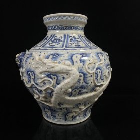 青花雕刻瓷盘白龙八宝纹饰双兽头大罐子,高37cm,宽33cm