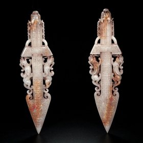 旧藏和田玉回纹双兽剑(两为一对),品质上佳,形态古朴自然,造型别致,古朴精美,玉质细腻,包浆油润,沁色十足。总重量:2620克长42厘米宽11.5厘米厚2.5厘米