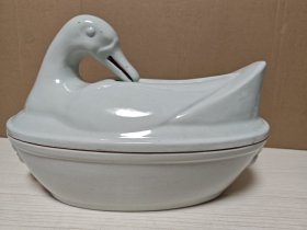 白釉大鸭子盖椭圆盆,双兽头
