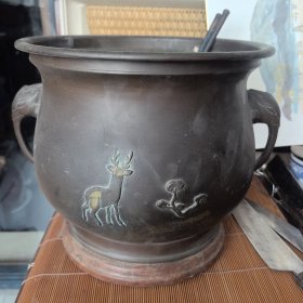 日本购回:日本明治时期铜火钵,双兽耳浮雕灵芝鹿纹饰,鹿是高浮雕有描金脱金痕迹,老铜火钵(底部是实木底座,底座有明治38年(1905年)墨笔书写的很多文字,百年老物件,重4.8斤,表面磨损磕碰划痕等岁月痕迹,有几个小破损飞皮,内残留一些香灰,送一对有樱花纹饰火箸)火钵是围炉煮茶的茶道具,底部铺上土或香灰,上面放置铁壶煮水,也适合冬季取暖,实用兼具收藏价值,喜欢不要错过 。