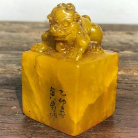 精品珍藏 辛卯年篆刻家【白石】刻石,寿山石荔枝冻田黄石雕刻瑞兽印章摆件,石质坚硬,细腻透亮,萝卜纹清晰呈现,观赏收藏之佳品! 规格:7×5×5cm 重量:322克 特价:200元
