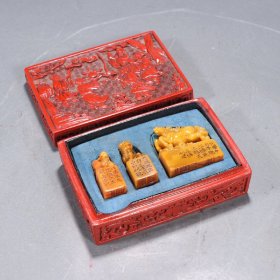 白石款 田黄石雕瑞狮钮印章文房一套