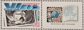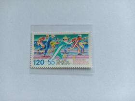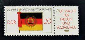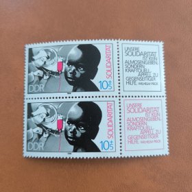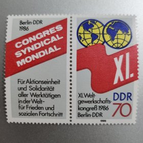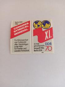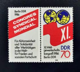 东德邮票 民主德国邮票 70Pfg 1986年柏林第11届世界工联大会 带连体附捐邮票 新票未使用 世界所有劳动者团结一致行动——和平与社会进步