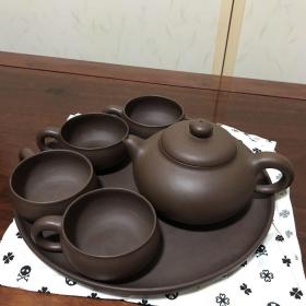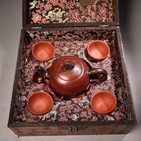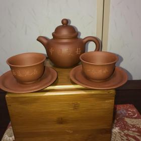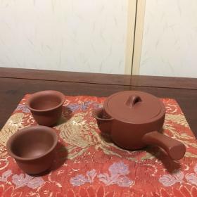H-0696日本回流 六十年代中国宜兴紫砂一厂 日本定制全手工 原矿朱泥紫砂泡瓶壶组1壶2杯 /底款:中国宜兴方款/容量:250毫升(顺丰到付不退换)