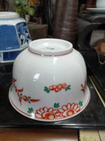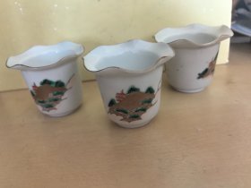 日本购回:日本昭和早期茶道具,柴烧老杯子,重金彩绘山水画片花瓣形口沿描金白瓷茶杯,酒杯,汤吞,老物件,口沿都有磕碰,冲线,介意勿拍 ,茶室摆件,种花种多肉均可,三个合售。