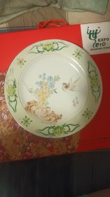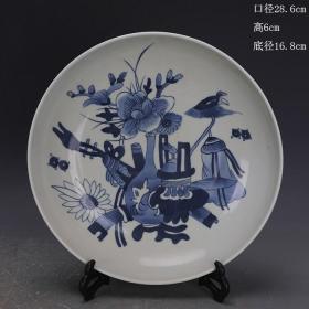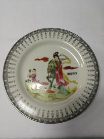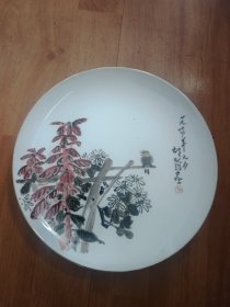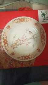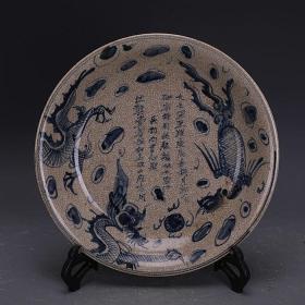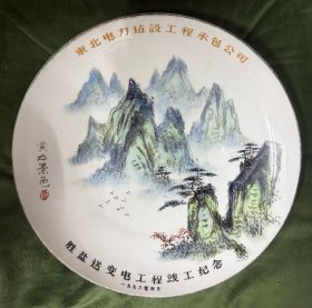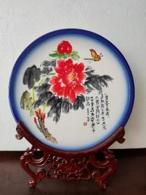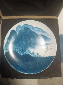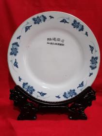 湖南醴陵瓷器《陆通酒店. 汕头公路局赞助》大瓷盘 瓷靓釉润 金声悠扬,精致手绘 深蓝青花边纹描金,纯手写落款。是 珍藏摆赏纪念之佳器。直径26厘米。(价不包含架子)