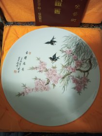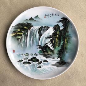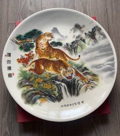 虎啸泉鸣瓷盘一个,手绘两只老虎图案,栩栩如生,盘面直径约40厘米。品相几乎全新,保存很好,下有“为张新田主任特制”字样,盘子无明显瑕疵。适合收藏或装饰。