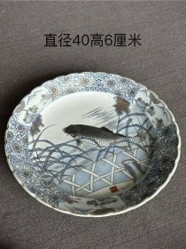 327_手绘鱼草图荷叶边口瓷盘子一块完好如图
