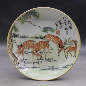 (手绘)民国粉彩福鹿图小瓷碟瓷盘