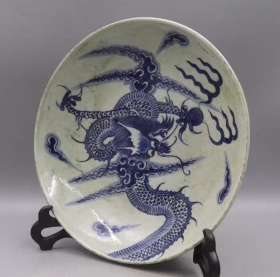 (手绘)晚清柴窑青花过墙龙大瓷盘