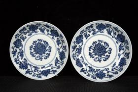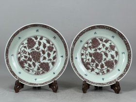明洪武釉里红缠枝莲花盘子一对