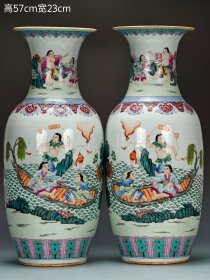 【刘海戏金蟾/步步钓金钱】粉彩通景群仙“福海刘海金蟾”纹赏瓶一对。 图中赏瓶做工精湛,民窑精品,粉彩满绘“刘海”群仙画篇,传统题材,福海刘海戏金蟾,步步钓金钱,寓意大富大贵,财源广进之意。整体施釉均匀饱满,釉水肥腴,紧皮亮釉,其施彩堆垛,触摸有明显凹凸质感回馈皮肤,迎光下可见釉彩蛤蜊光氧化现象,浅表可见润光吃光现象,其胎骨坚实,压手十足,器形端庄周正,健硕挺拔,敦厚古朴,一眼大开门,品相完整