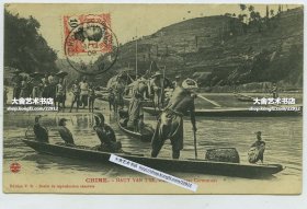 清代长江上游江岸百姓和使用鱼鹰打渔的船夫老明信片张,1909年实寄,贴法属印支中国10分邮票,销重庆邮戳,最终寄法兰西,落地戳,经转地戳俱全。