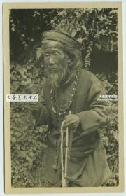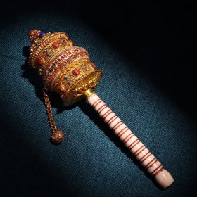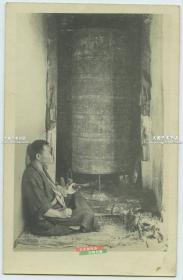 民国时期西藏转经桶前的男子老明信片,转经桶是藏传佛教的主要法器之一,与六字真言(六字大明咒)有关,藏传佛教认为,持颂六字真言越多,越表对佛的虔诚,可得脱轮回之苦。